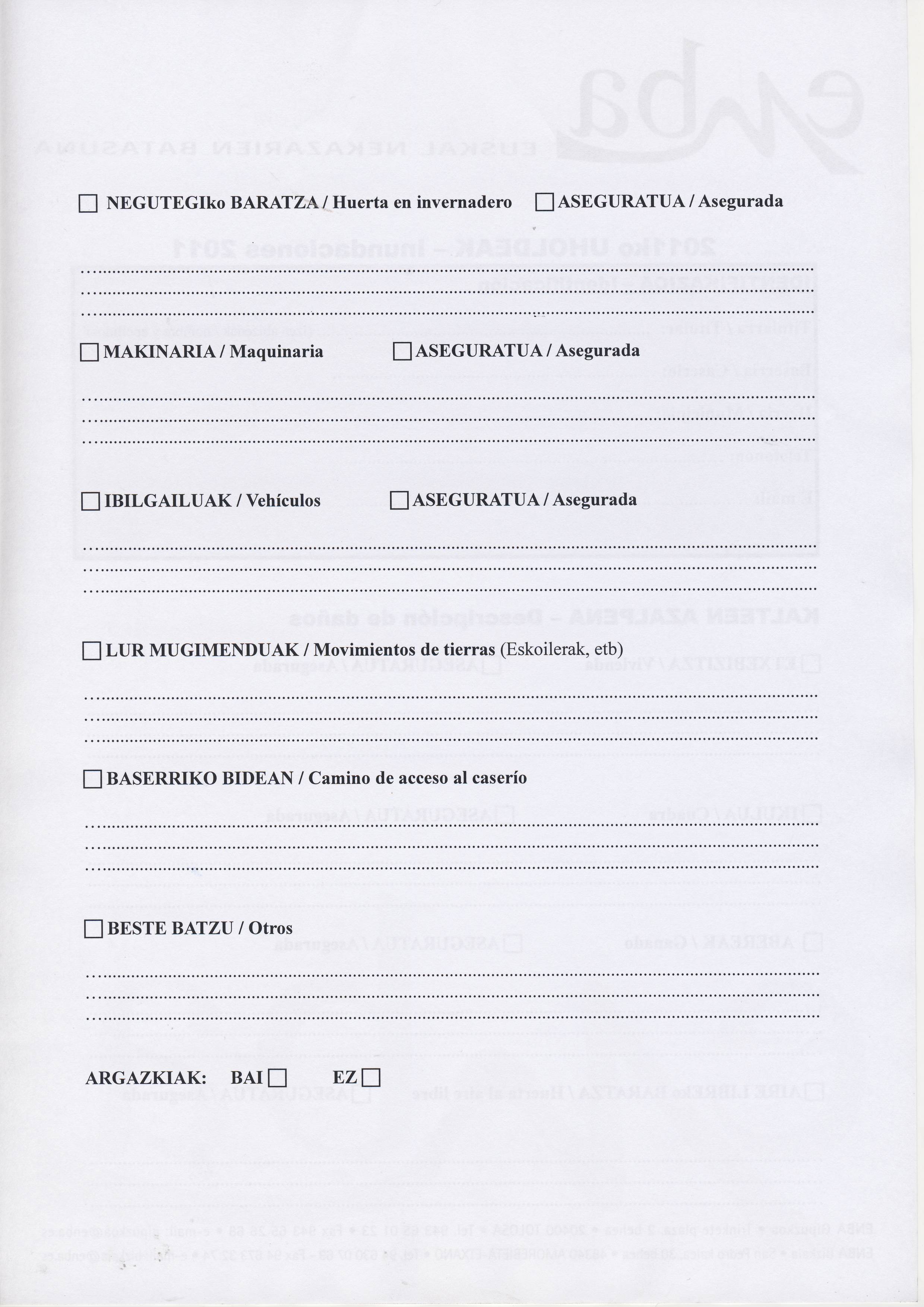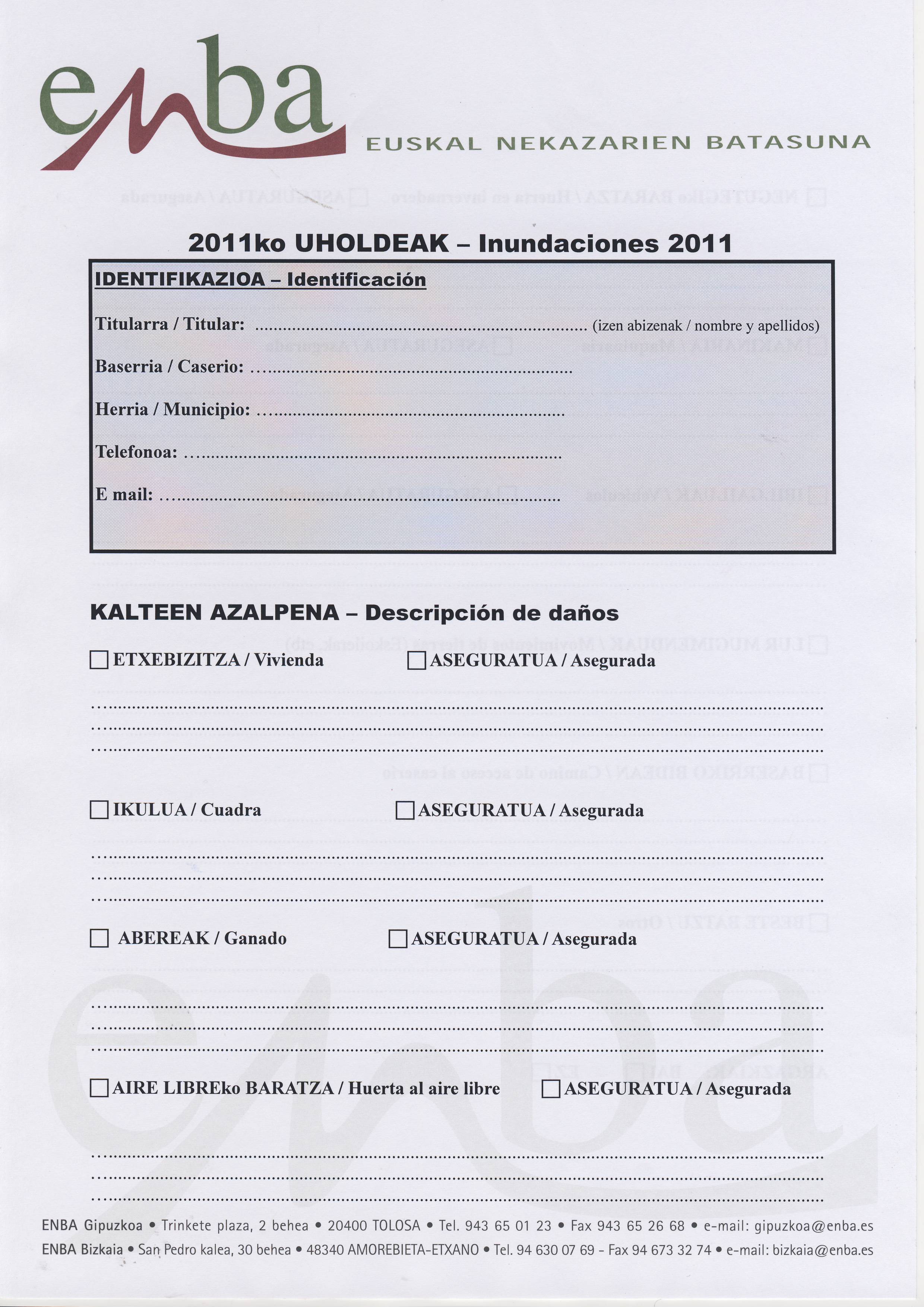 Desde el sindicato ENBA se ha repartido un cuestionario a rellenar por los baserritarras que cada uno de ellos deberá presentar en su correspondiente ayuntamiento, acompañado de fotos y vídeos, además de aportar una copia al sindicato para que éste presente una reclamación conjunta ante las instituciones y provocar así, que los responsables políticos despierten y tengan en cuenta los destrozos causados en estas explotaciones agrarias.